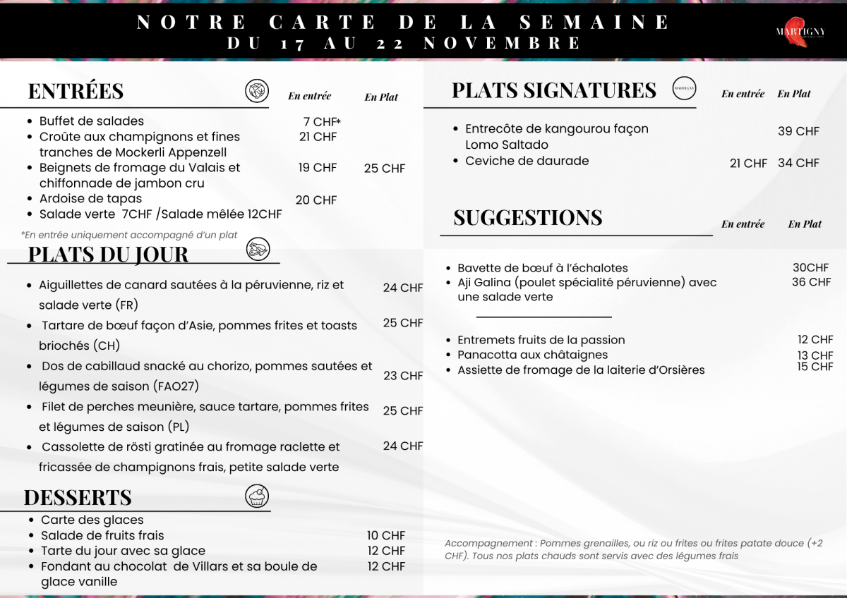 Chaque midi, retrouvez nos délicieux menus avec notre buffet de salades, le choix entre nos plats principaux pour toute la semaine (2 plats à base de viande, 2 poissons et 1 végétarien) ainsi que nos desserts. Découvrez également nos suggestions qui sont toujours disponibles.